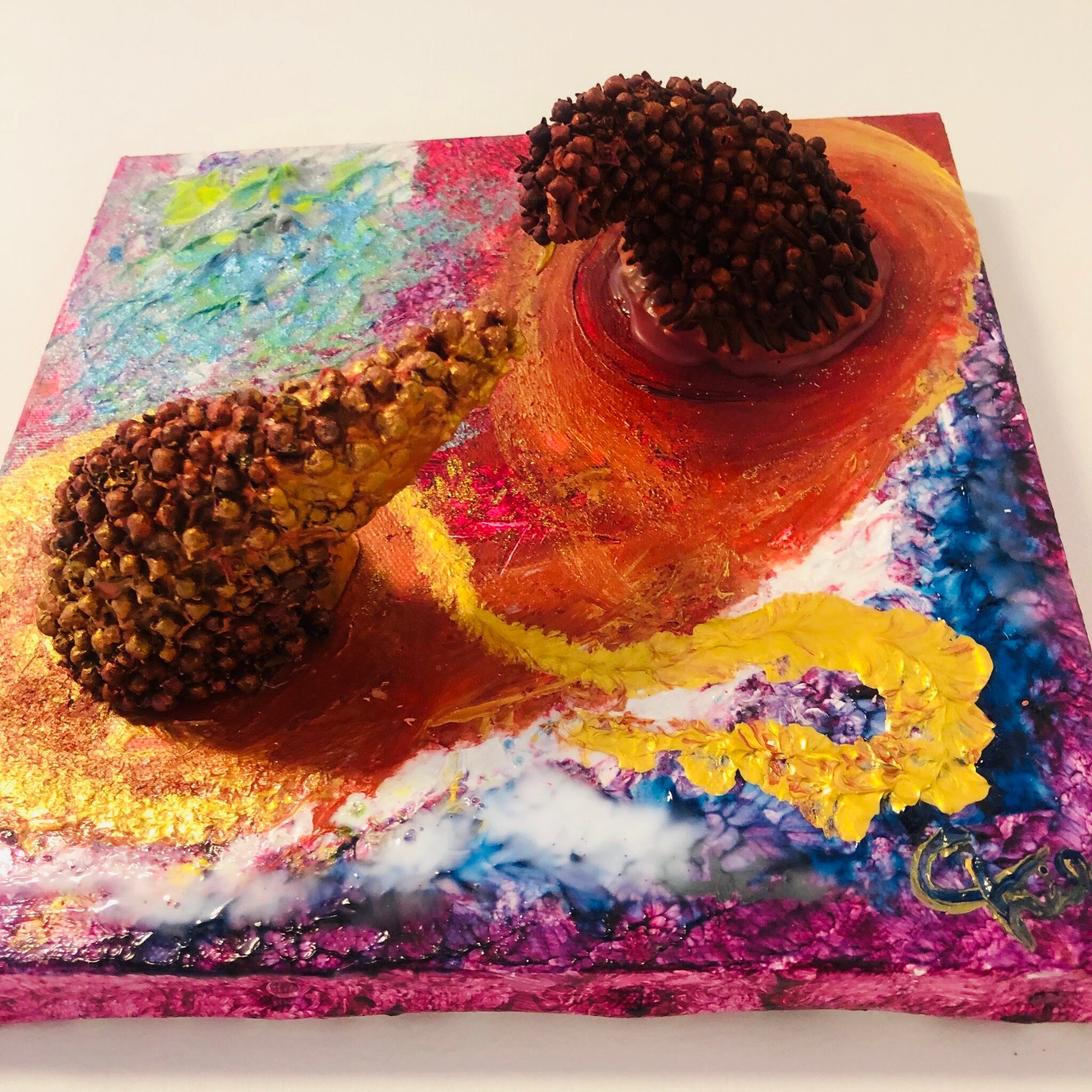 グリッター、クローブ、エッセンシャルオイル(パチュリ)、キャンバス