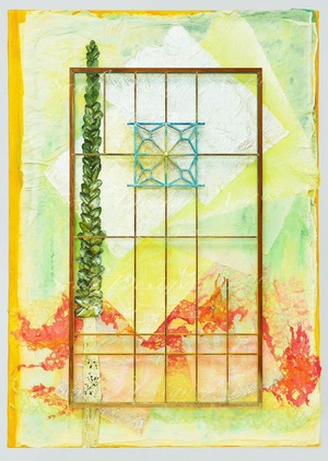 素材:アキーラ、アクリル絵具、日本家屋格子、島根県石州和紙、ユーカリ葉、メディウム、キャンバス